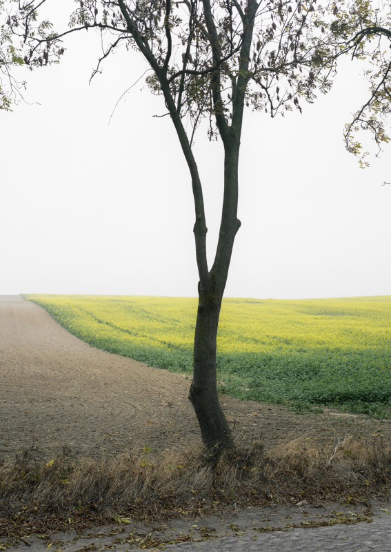 Schinks Stärke liegt darin, der Peripherie ihre Widerspenstigkeit zu lassen. Sie so rau und karg zu zeigen, wie sie bisweilen ist. Seine Aufnahmen sind Achtsamkeitsübungen auf dem Papier. Sie führen vor, dass Aushalten und Innehalten manchmal nah beisammen liegen. Scheinbar beiläufig führt der Fotograf Farbe in sein Werk ein. Wo die Winterlandschaft anfangs vom Schwarz-Weiß aus Baumsilhouetten und Schnee dominiert wird, weitet sich die Palette, je weiter man voranschreitet. Vor dem trüb verhangenen Himmel fängt Schink zarte Stillleben ein, lässt Schneebeeren wie kleine weiße Tupfer im braunen Gestrüpp aufleuchten, zeigt Heuballen, überzogen mit zartrosafarbenen Hüllen, gelben Raps und grüne Schutzplanen.